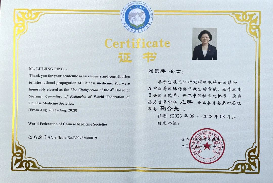 利来w66药业集团党委书记、董事长刘景萍当选世界中医药学会联合会儿科专业委员会第四届理事会副会长